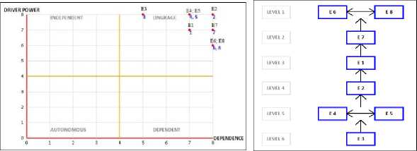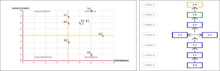 3. Membuat matriks Canonical, canonical matrix dikembangkan dengan cara clustering faktor pada tingkat yang sama lintas baris dan kolom dari final Reachability Matrix. Drive Power faktor diperoleh dengan menjumlahkan angka satu pada baris sedangkan dependence power dengan menjumlahkan angka satu pada kolom (Raj et al., 2012; Attri et al., 2012). Selanjutnya peringkat drive power dan dependence power dihitung dengan memberikan peringkat tertinggi untuk faktor-faktor yang memiliki jumlah maksimum angka satu pada baris dan kolom.