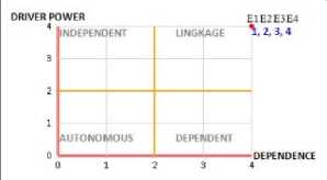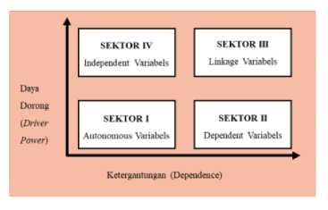 4. Matrix of cross impact multiplications applied to classification (MICMAC) analisis, digunakan untuk menganalisis kekuatan penggerak (driver power) dan kekuatan ketergantungan (dependence power) dari berbagai faktor, sehingga faktor kunci dalam sistem dapat teridentifikasi. Selanjutnya faktor-faktor diklasifikasikan menjadi empat kategori. Penjelasan secara rinci dapat dilihat pada gambar 2.