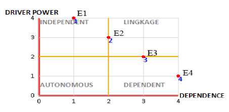 d. Sektor IV, merupakan independent factors (strong driver – weak dependent variables) faktor yang masuk sektor ini merupakan faktor yang mempunyai kekuatan penggerak yang kuat dan ketergantungan yang lemah. Faktor di sektor ini merupakan faktor yang menjadi faktor kunci dalam pembangunan model.