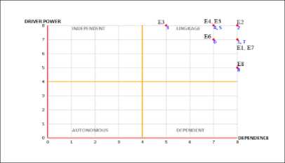 b. Sektor II, merupakan Dependent factors (weak driver-strongly dependent variables) faktor yang masuk sektor ini merupakan faktor yang mempunyai kekuatan penggerak yang lemah dan ketergantungan yang kuat. Faktor dalam sektor ini relatif terputus dari sistem dan memiliki sedikit link, tetapi bisa jadi pengaruhnya sangat kuat.