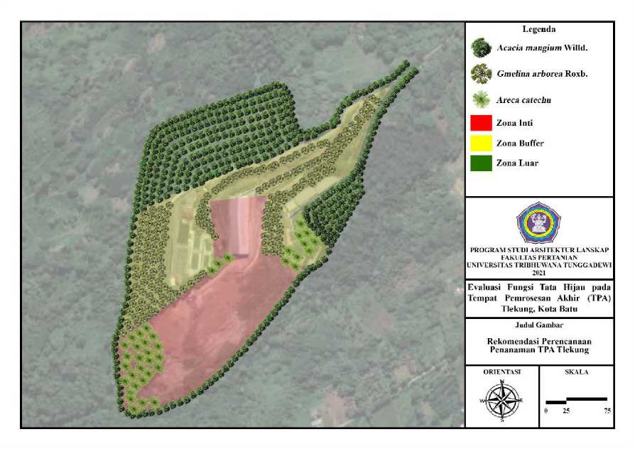 Evaluation of the Green Planning Function at the Tlekung Final Processing Site (TPA), Batu City. The problem of waste, especially in the Final Processing Site (TPA) area, is a major issue in Indonesia, so it requires integrated and comprehensive handling. TPA Tlekung, Junrejo District, Batu City has a land area of 6 hectares by applying the sanitary landfill method. The existence of TPA Tlekung is an effort of the Batu City Government in handling municipal waste, but the landscape arrangement for waste management is not optimal. The objectives of this research are to (i) identify the type of vegetation and green system; (ii) analyze the suitability of pollutant reducing function in the TPA Tlekung area, Batu City; and and (iii) planting planning recommendations. Therefore, it is necessary to arrange a landscape in the TPA Tlekung area, in particular by increasing the function of vegetation and green systems as a pollutant reduction agent. Based on the results of observations, the results of the suitability function of reducing pollutant substances that have an inappropriate status of 5.00% (20 trees), unsuitable status 55.75% (223 trees), appropriate status 30.50% (122 trees), and very suitable status 8.75% (35 trees). The shape of the canopy is dominated by spreading-shape canopy of 215 trees and an umbrella-shaped canopy of 68 trees. Existing vegetation types that have a suitable function to reduce pollutants are Areca catechu, Acacia mangium Willd., and Gmelina arborea Roxb. Recommendations that can be given for green planning in TPA Tlekung are replanting in the core zone, buffer zone, and outer zone; maintenance of vegetation; and improvement of the growing environment.