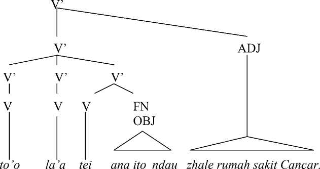 Pada diagram (5) di atas, tampak bawa OBJ ana ito ndau ‘anak kecil itu’ bersama verba tei ‘lihat’ sebagai sudaranya, berada di bawah simpul V’. Itu berarti bahwa ana ito ndau merupakan OBJ dari verba tei, bukan OBJ KVS to’o la’a tei ‘pergi lihat/jenguk’. Kondisi ini tentu saja dipandang wajar karena secara alamiah
