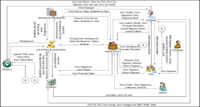 Gambar 1 menunjukan Sistem Informasi Front Office yang dirancang berkaitan dengan enam modul lainnya. Enam modul tersebut adalah Layanan, Farmasi, Sarana & Prasarana, Human Resource Development, Payroll, dan Akunting & Keuangan. Pertukaran data diperlukan karena tiap proses dalam sebuah sistem, memerlukan data dari modul lain untuk dapat menjalankan proses tersebut.