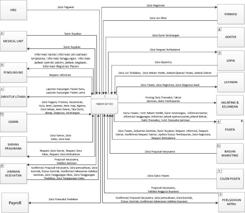1. Hubungan Sistem Front Office dengan Pasien yaitu Pasien akan memberi informasi data pasien, dokumen jaminan, dan surat rujukan. Front Office akan memberikan kartu pasien, form rekam medis, surat keterangan sakit, surat keterangan sehat, informasi ketersediaan kamar, informasi kamar, informasi perusahaan, informasi jadwal operasi pasien, jadwal dokter, bukti transaksi ke pasien.