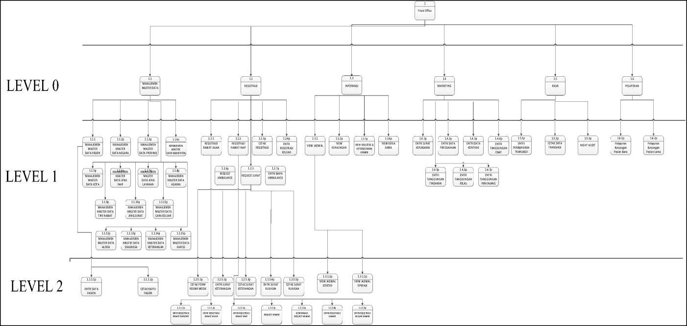 Gambar 3 merupakan gambar Diagram Berjenjang atau Hierarchy Chart dari Sistem Informasi Rumah Sakit Modul Front Office. Diagram Berjenjang atau Hierarchy Chart digunakan untuk menggambarkan proses-proses dari Overview Diagram hingga Diagram Alir Data Level selanjutnya.