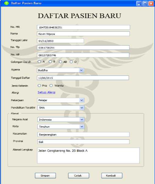 Form Daftar Pasien Baru merupakan tampilan saat Admin ingin meng-input data pasien baru yang baru pertama kali berkunjung ke rumah sakit.