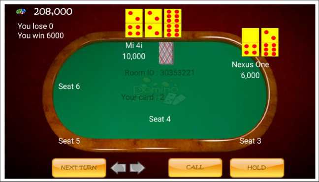 Gambar 9 menampilkan tampilan pada saat pemain mendapatkan kartu pertama. Pembagian kartu dilakukan dengan carasharing resource array kartu yang dimiliki oleh dealer, deck kartu hanya dimiliki oleh dealer. Penentuan udeg oleh dealer ditentukan pada tahap ini. Gambar 9 menunjukkan jumlah udeg oleh dealer sebesar 10,000 dan nilai kartu yang dimiliki oleh dealer sebesar enam.