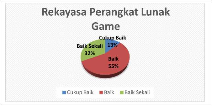 Aspek rekayasa perangkat lunakresponden memberikan respon cukup baik dengan persentase 13%, kemudian baik dengan persentase 55% dan sangat baik dengan persentase 32%. Persentase tertinggi terdapat pada pilihan baik, sehingga dapat disimpulkan bahwa aspek rekayasa perangkat lunak dalam game ini berjalan baik, hal ini dikarenakan Game Kartu Spirit ini dapat dijalankan hampir di semua device Android.