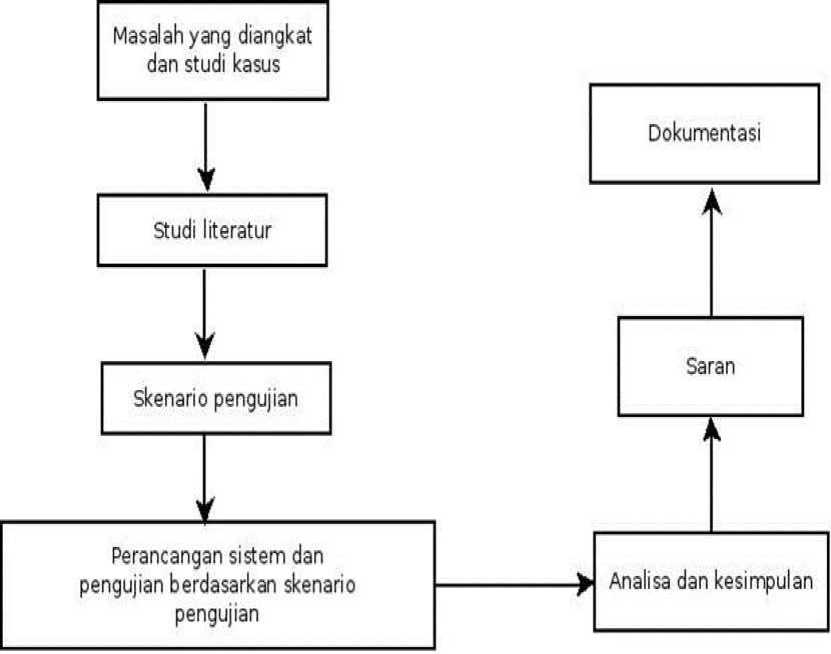 Perancangan skenario pengujian di dalam penelitian ini, menggunakan metodologi penelitian Design Science Research Method (DSRM) [9] yang terdiri atas tujuh langkah terurut. Meliputi pemilihan masalah yang diangkat dan studi kasus berdasarkan topik penelitian, studi literatur dari berbagai sumber referensi (paper, web) mengenai topik yang diangkat, menyusun skenario pengujian, perancangan sistem dan pengujian sistem berdasarkan skenario yang dibuat, analisa dan kesimpulan, penyajian saran, serta dokumentasi. Gambar di bawah ini, menunjukkan bagan dari metodologi penelitian yang digunakan.