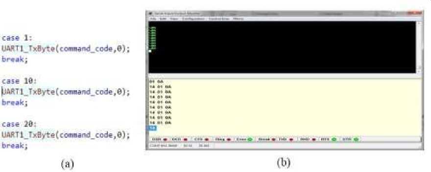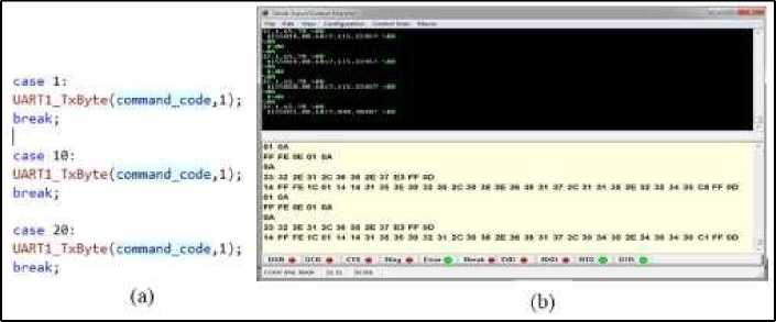 Gambar 12. Hasil Uji mode MPC (a) List kode fungsi untuk mengirim data, (b) hasil data dump serial line.