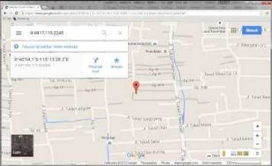 Titik koordinat latitude dan longitude hasil pengukuran pada Piranti Slave #2 jika diinputkan menggunakan bantuan Google Maps API’S pada halaman website https://www.google.co.id/maps akan ditampilkan lokasi pengukuran berupa peta digital seperti terlihat pada Gambar 7. Ikon merah merupakan lokasi titik koordinat hasil ukur yang disajikan dalam bentuk peta digital dengan menggunakan bantuan Google Maps API’S. Hasil pengukuran yang disajikan masih mengalami offset sejauh ± 3 Meter hal ini dipengaruhi oleh sensitifitas ukur dari sensor GPS yang dipergunakan.