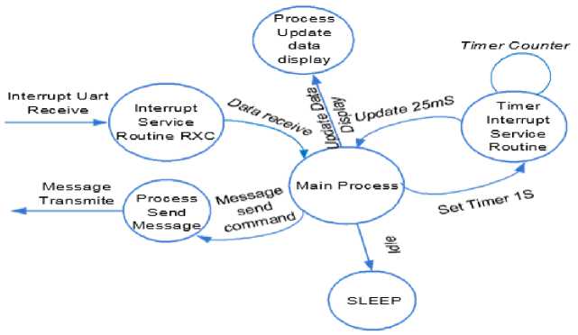 Master memberikan perintah kepada slave dalam bentuk pesan alamat (address). Pesan tersebut di-generate pada interval waktu 25 mS memanfaatkan fungsi interrupt timer tiap satu detik. Selama satu detik Master mampu mengenerate sebanyak 40 pesan secara berulang. State diagram perangkat lunak Master seperti terlihat pada Gambar 6 [7].