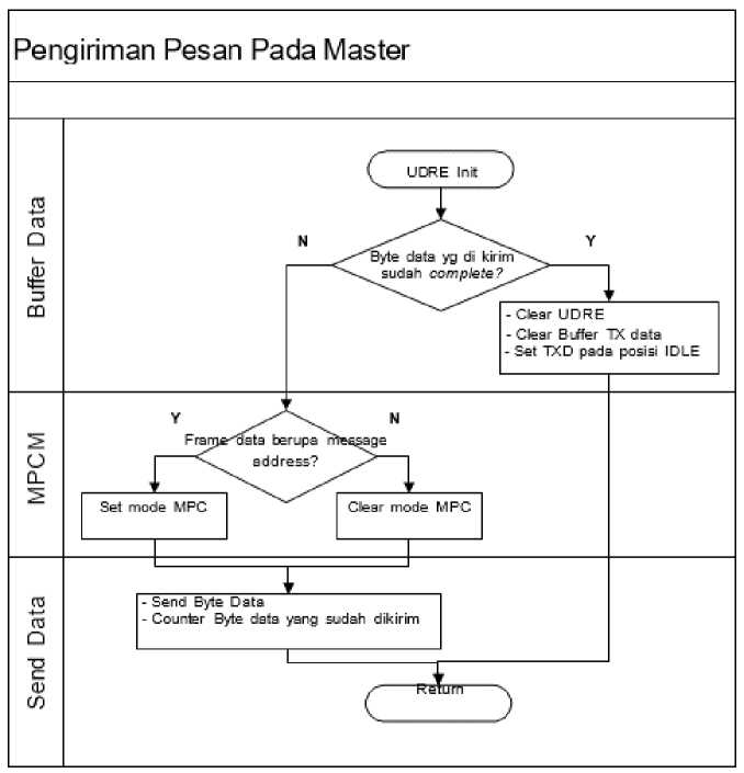 Mode Multi Processor Communication (MPC) membedakan pesan menjadi dua bagian yaitu pesan berupa alamat dan pesan berupa data. Skema MPC pada Master men-generate pesan berupa alamat yang nantinya diterjemahkan oleh slave menjadi kode perintah. Desain skema diagram proses pengiriman pesan dengan menggunakan mode MPC seperti terlihat pada Gambar 7.