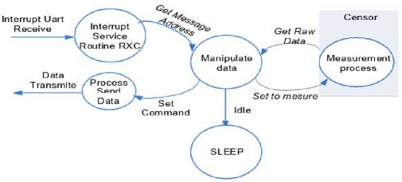Slave berinteraksi dengan sensor melalui antarmuka sistem komunikasi yang disediakan untuk melakukan proses ukur dan mengolah data hasil ukur yang diterima oleh sensor. Proses ini dilakukan jika terdapat pesan yang diberikan oleh master berupa pesan alamat yang menyatakan bahwa sensor malakukan pengukuran secara serentak (broadcast).