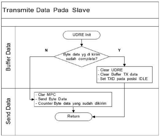 Nilai hasil olah data ini disimpan sementara pada buffer hingga slave mendapatkan perintah pesan alamat oleh master untuk mengirimkan data hasil ukur sensor pada selang waktu berikutnya. Secara default Slave berada pada kondisi IDEL jika tugas yang diberikan oleh master telah selesai dikerjakan slave masuk dalam mode SLEEP. State diagram perangkat lunak Slave seperti terlihat pada Gambar 8. Proses pengiriman data pada slave menggunakan mode clear mode MPC karna slave hanya mengirimkan data kepada master dan tidak melakukan komunikasi dengan slave yang lain. Desain skema diagram proses pengiriman data pada slave seperti terlihat pada Gambar 9.