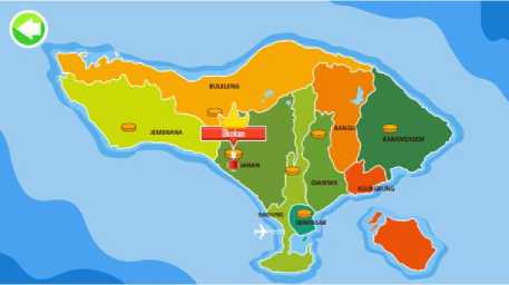 Gambar 8 merupakan tampilan menu Main, terdiri dari 6 button untuk menuju ke permainan di kabupaten/kota yang di dalamnya terdapat permainan kecil Bali yaitu puzzle. User terlebih dahulu harus menyelesaikan permainan Mengumpulkan Huruf untuk menuju ke kabupaten/kota tersebut. Permainan Tanya Jawab muncul setelah semua tantangan di semua kabupaten/kota terselesaikan, permainan Tanya Jawab bertujuan untuk mengevaluasi kemampuan user.