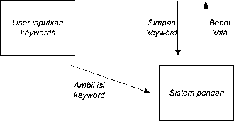 Proses search diawali dengan menginputkan keywords yang akan dicari oleh user. Keywords dapat terdiri atas beberapa kata. Pada metode latent semantic indexing, keywords diperlakukan seperti sebuah dokumen, maka terhadap keywords dilakukan proses preprocessing dan perhitungan bobot tiap kata yang ada di dalamnya. Perhitungan vektor koordinat dari keywords dilakukan dengan menggunakan nila-nilai dari tabel nilai_u dan file singularvalue kemudian untuk perhitungan similarity keyword dengan dokumen, digunakan nilai-nilai pada tabel nilai_v yang merupakan vektor koordinat dari tiap-tiap dokumen dan digunakan metode cosine similarity untuk mendapatkan nilai similarity antara vektor keywords dengan dokumen