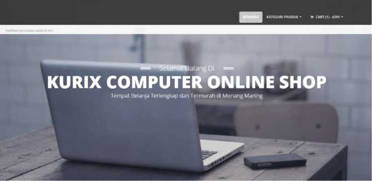 Tampilan yang akan terlihat pada browser pertama kali ketika alamat sistem dibuka yaitu halaman tampilan utama. Tampilan halaman utama ini di desain sederhana dengan warna utama adalah hitam dan biru muda. Pada header terdapat nama situs yaitu “Kurix Komputer Online Shop” dengan background gambar laptop dan handphone. Diatasnya terdapat link utama dalam web yaitu link beranda,dan Kategori produk.Jika kursor diarahkan ke tombol beranda maka halaman akan menuju ke beranda atau halaman utama.