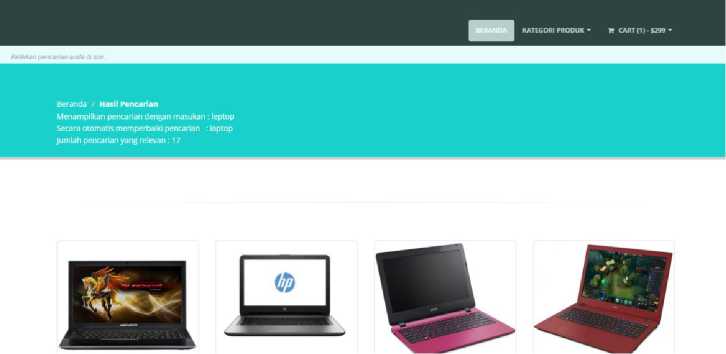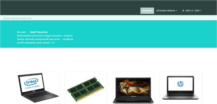 Contoh operasi penambahan karakter misalkan pada input kata “noteboo” kata yang seharusnya adalah “notebook” tetapi user melakukan kesalahan input sehingga input kekurangan satu karakter pada akhir kata. Metode levenhstein akan melakukan looping pengecekan pada tiap karakter hingga akhirnya ditemukan satu kekurangan karakter pada akhir kata. Tampilan pada web nya seperti Gambar 6.