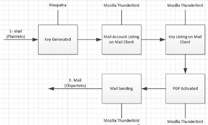 Seperti yang sudah dibahas sebelumnya bahwa pengamanan komunikasi email menggunakan PGP teknik diawali dengan adanya kepemilikan kunci private. Kunci private ini dimiliki oleh kedua aktor yaitu pengirim email dan penerima email. Kunci ini harus ada sebelum pengiriman email dilakukan (proses 1 dan 2 pada gambar 5). Setelah kunci private dikirimkan oleh kedua aktor, dilakukannya pengiriman pesan oleh pengirim. Pesan yang dikirimkan dienkripsi sebelum dikirimkan ke penerima. Sehingga pesan dikirimkan adalah dalam bentuk chiperteks (pesan tersandikan). Adapun proses penyandian yang dilakukan adalah menggunakan kunci public. Pengiriman dilakukan di atas platform mesin zimbra. Dari sisi penerima, penerima akan menerima dalam bentuk chiperteks. Chiperteks yang diterima akan di dekrip kembali menggunakan kunci private yang telah dimiliki di awal komunikasi. Dengan kepemilikan kunci private, maka pesan dapat ditampilkan kembali. Apabila kunci private yang digunakan untuk mendekrip tidak sama dengan kunci private pengirim, maka pesan tersebut tidak dapat terbaca. Pengujian yang dilakukan dalam penelitian adalah dengan membandingkan mekanisme pengiriman dan penerimaan email antara pengiriman email standard dan pengiriman yang menggunakan teknik PGP. Hasil pengujian pertama adalah membandingkan bentuk PGP yang digambarkan sebagai berikut :