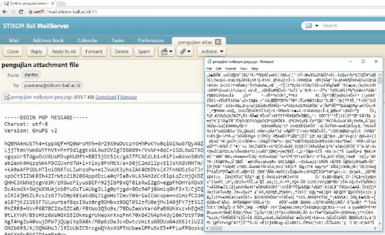 Dari Gambar 5 dapat dilihat bahwa hasil pengamanan dengan PGP merubah teks dalam email menjadi teks yang tidak dapat terbaca atau dalam bentuk sandi yang disebut chiperteks. Pengujian kedua dilakukan dengan membandingkan file attachment pada pengiriman email, Setelah dilakukan pengiriman file attachment dianalisa dari bentuk penerimaan dan perubahan size ukuran file attachment. Hasil penerimaan file PGP dengan browser dan pembandingan ukuran size ditunjukkan pada gambar berikut :