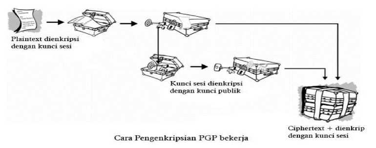 PGP (Pretty Good Privacy) adalah suatu metode program enkripsi informasi yang memiliki tingkat keamanan cukup tinggi bersifat rahasia dengan menggunakan “PrivatePublic Key” sebagai dasar autentifikasinya sehingga jangan sampai dengan mudah diketahui oleh orang lain yang tidak berhak. PGP membuat sebuah session key, dimana sebuah kunci rahasia pada saat itu. Kunci adalah sebuah bilangan acak yang dihasilkan dari gerakan acak dari mouse dan tombol yang anda tekan. Session Key ini berkerja dengan sangat aman, algoritma enkripsi konvesional yang cepat untuk meng-enkrip plaintext. Hasilnya adalah berupah chiper text. Sekali data dienkripsi, lalu session key ini dienkripsi lagi menggunakan kunci publik penerima. session key yang terenkripsi kunci publik key penerima dikirim dengn chipertext ke penerima. Proses deskripsi bekerja sebaliknya, Penerima menerima pesan lalu membuka pesan tersebut dengan kunci privatnya, namun pesan tersebut masih terenkripsi dengan session key. Dengan Menggunakan PGP, penerima mendekrip chipertext yang terenkripsi secara konvensional. Kombinasi dari 2 metode enkripsi menggabungkan kehandalan dari enkripsi kunci publik dengan kecepatan pada enkripsi konvensional. Enkripsi Konvensional kuarang lebih 1000x lebih cepat dari enkripsi kunci publik. Jadi enkripsi kunci publik memberikan sebuah solusi pada distribusi kunci dan masalah transmisi data. Dengan menggunakan keduanya, perfoma dan distribusi kunci dapat ditingkatkan tanpa mengorbankan sesuatu dalam keamanan.