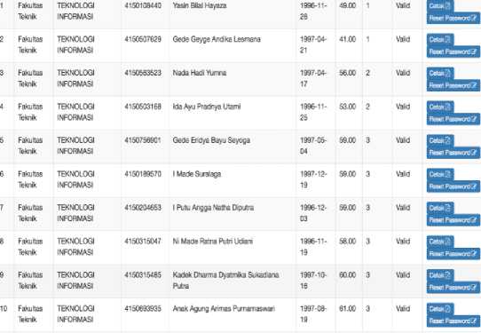 Gambar 3 merupakan tampilan form isian yang akan diinput oleh calon mahasiswa baru, terdiri dari beberapa group dan masing-masing group terdiri dari beberapa pertanyaan. Gambar 4 merupakan tampilan dashboard admin terdapat beberapa menu yaitu diantaranya lihat UKT untuk melihat isian UKT calon mahasiswa baru, Group UKT untuk melakukan setting nominal UKT tiap jurusan dan persentase masing-masing golongan UKT, menu hitung UKT untuk melakukan proses perhitungan dengan metode fuzzy c-means, dan menu assign untuk melakukan import data calon mahasiswa baru. Gambar 5 merupakan tampilan hasil perhitungan yang menampilkan golongan UKT calon mahasiswa baru.