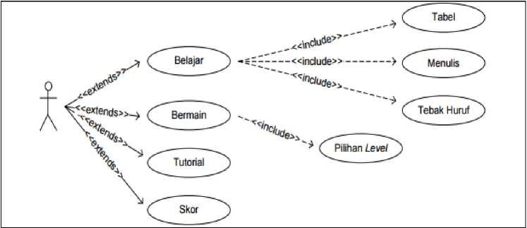 Use Case Diagram pada Gambar 1 merupakan salah satu diagram UML sebagai pemodelan sistem yang digunakan untuk mengilustrasikan arsitektur atau gambaran umum dari game edukasi ini. Use Case Diagram menunjukkan interaksi antara actor/user dengan fungsi yang terdapat pada sistem game edukasi ini. Terdapat empat pilihan menu utama dalam game yaitu bermain, belajar, tutorial dan skor. Dua elemen utama yang ditekankan dalam game yaitu fitur belajar sebagai media pembelajaran dan fitur bermain sebagai hiburan sekaligus sebagai media untuk menguji kemampuan pengguna setelah belajar. Kedua elemen utama ini diimplementasikan kedalam menu utama game yaitu menu belajar dan bermain.