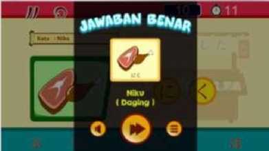 Gambar 10 merupakan tampilan scene saat bermain, dimana pada scene ini terdapat beberapa buah jawaban yang letaknya diacak kemudian user harus menyusun huruf sesuai dengan soal berupa kata yang muncul sebelum waktu habis. Gambar 11 merupakan tampilan pop up ketika jawaban yang dimasukkan benar. Terdapat tombol sound untuk mendengar bagaimana pengucapan dari kata tersebut.