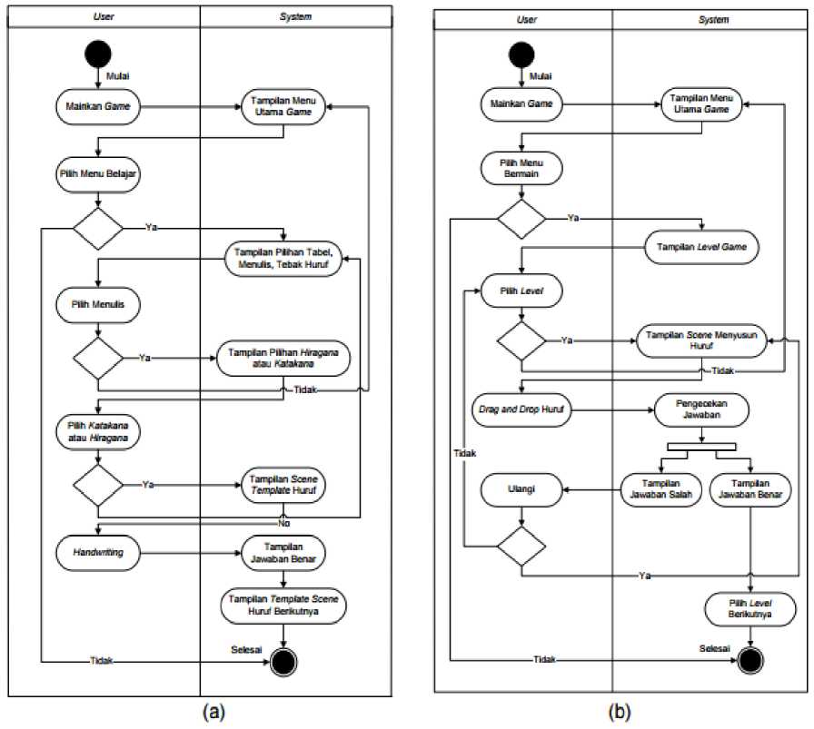 Gambar 2(a) menunjukkan activity diagram antara user dan sistem pada menu belajar pilihan fitur menulis. Alur pada fitur menulis ini dimulai dari user menjalankan game kemudian sistem merespon dengan menampilkan menu utama pada game. User dapat memilih menu utama Belajar untuk menggunakan fitur menulis atau pilihan keluar dari game. Sistem merespon kembali dengan menampilkan tiga pilihan fitur yang terdapat pada menu utama Belajar. Fitur menulis dapat digunakan user dengan memilih pilihan menu menulis dari ketiga pilihan menu yang ada atau pilihan kembali ke menu utama game. Sistem menampilkan pilihan dua jenis huruf Katakana atau Hiragana pada fitur menulis. User dapat memilih salah satu jenis huruf kemudian sistem menampilkan scene yang berisi template huruf untuk ditulis. Sistem menampilkan tanda benar kemudian muncul template huruf berikutnya jika user telah menulis huruf dengan benar.