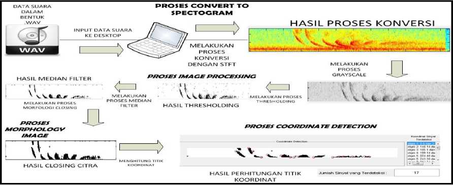 Gambaran umum sistem pada Gambar 1 menjelaskan bahwa proses aplikasi dimulai dengan melakukan input data audio ke dalam aplikasi. Data audio tersebut kemudian dikonversi dengan menggunakan metode STFT hingga hasilnya keluar pada aplikasi. Proses image processing dilakukan pada citra hasil konversi, dimulai dari proses grayscale, thresholding, dan median filter. Proses selanjutnya adalah melakukan proses morphology image dengan metode closing. Perhitungan titik koordinatnya kemudian dilakukan setelah citra hasil proses morphology image diperoleh. Alur bagaimana jalannya aplikasi dituangkan dalam bentuk flowchart atau alur data aplikasi.