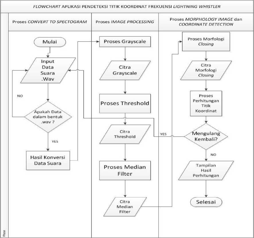 Flowchart pada Gambar 2 menunjukkan alur proses aplikasi secara spesifik bagaimana aplikasi dapat berjalan. Alur dimulai dengan melakukan input data audio whistler kemudian dilakukan pengecekan apakah data yang dimasukkan dalam format .wav, jika salah maka harus memulai input ulang data dan jika benar maka dilanjutkan dengan melakukan konversi data sampai mendapatkan hasil. Alur dilanjutkan ke proses image processing dimana proses ini dilakukan secara berurutan dimulai dengan melakukan proses grayscale, thresholding, dan median filter. Hasil dari image processing dilanjutkan ke proses morphology image menggunakan metode closing dengan hasil citra yang lebih mudah dideteksi sinyalnya. Alur berlanjut ke proses deteksi perhitungan titik koordinat untuk mendapatkan hasil lokasi titik koordinat.