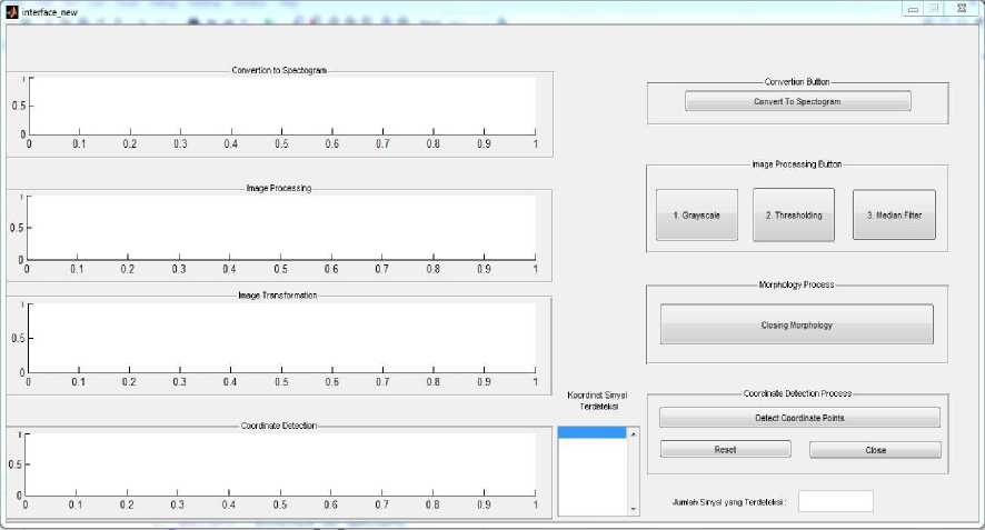 Tampilan interface pada Gambar 3 merupakan tampilan yang memiliki 4 proses utama dimana proses utama tersebut meliputi proses Convertion, Image Processing, Morphology Process, dan Coordinate Detection Process. Proses Convertion merupakan proses konversi data audio menjadi bentuk citra spectogram. Proses Image Processing Button merupakan proses pada data citra spectogram dengan output hasil adalah dalam bentuk citra biner. Proses Morphology Process adalah untuk mendapatkan citra hasil dengan penebalan sinyal yang lebih detail. Proses Coordinate Detection Points adalah proses yang bertujuan melakukan hitungan titik koordinat sehingga menampilkan informasi mengenai sinyal yang dideteksi.