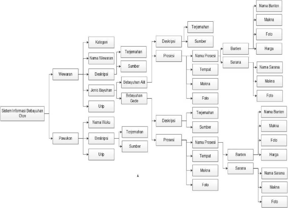 Gambar 1 menampilkan diagram tree upacara Bayuh Oton. Pemodelan sistem yang digunakan adalah diagram tree untuk menghubungkan prosesi dengan banten dan sarana yang digunakan. Data prosesi menampilkan nama prosesi tempat, makna dan foto. Data sarana menampilkan nama sarana, makna dan foto. Data banten yang ditampilkan adalah nama banten, makna, foto dan harga.