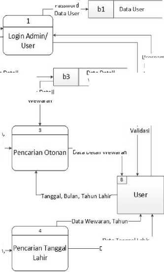 Gambar 3 merupakan data flow diagram level 0 Sistem Informasi Bebayuhan Oton yang memiliki 4 buah proses dan 2 entitas. Proses yang ada pada sistem adalah proses login admin atau user, proses manajemen master data, proses pencarian otonan dan proses pencarian tanggal lahir Entitas yang ada pada sistem yaitu admin dan user.