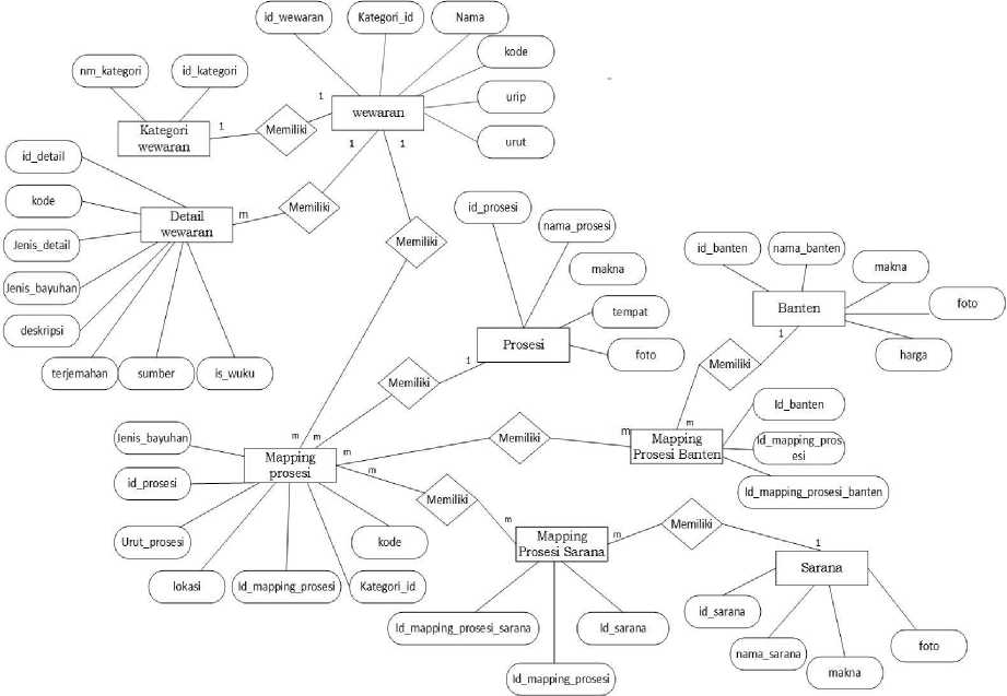 Gambar 4 merupakan Entity dan Relationship yang terlibat dalam Sistem Informasi Bebayuhan Oton. Entitas yang dimiliki berjumlah 9 yang terdiri dari wewaran, detail wewaran, prosesi, banten, sarana, mapping prosesi, mapping prosesi sarana, mapping prosesi banten.