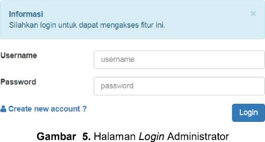 Gambar 5 merupakan halaman yang menampilkan form login yang digunakan untuk membatasi akses. Akses yang diijinkan hanya memiliki username dan password yang telah terdaftar pada sistem atau telah melakukan proses registrasi.
