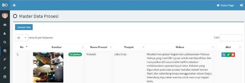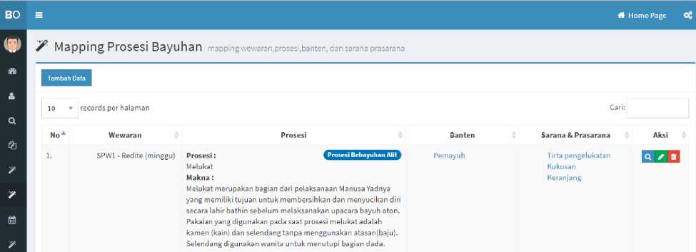 Gambar 6 merupakan halaman master data prosesi yang menampilkan gambar atau foto prosesi, nama, makna prosesi dan tempat dilaksanakannya prosesi tersebut. Data prosesi bersumber dari upacara Bebayuhan Oton yang dilaksanakan di Griya Gede Wayahan Buruan Manuaba, Blahbatuh, Gianyar. Warna pakaian yang digunakan dalam upacara Bayuh Oton ditentukan berdasarkan hari kelahiran (saptawara).