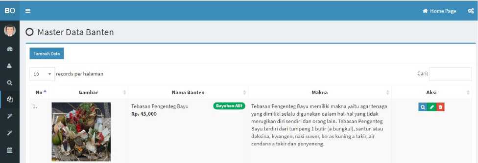 Gambar 7 merupakan tampilan dari master data banten yang menampilkan foto banten, nama, makna banten yang disertai komponen yang terdapat pada banten serta harga banten. Banten bayuhan yang digunakan, ditentukan berdasarkan hari kelahiran (saptawara dan pancawara). Banten yang jadi pembeda adalah banten sesayut dimana masing-masing hari memiliki banten Sesayut yang digunakan. Banten yang digunakan dalam upacara Bebayuhan Oton menyesuaikan bentuk atau jenis bebantenan sesuai dengan desa kala patra yang berlaku di Griya Gede Wayahan Buruan Manuab, Blahbatuh, Gianyar (tempat dilaksanakanya penelitian).