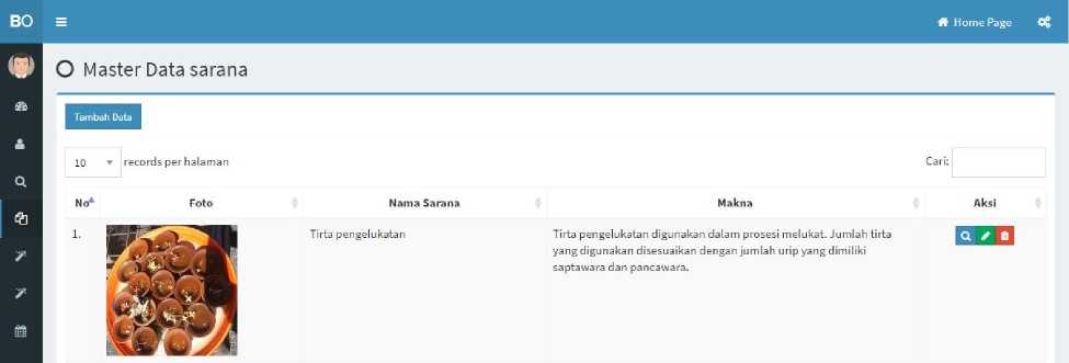 Gambar 8 merupakan master data sarana yang menampilkan gambar, nama sarana dan makna. Sarana yang digunakan dalam setiap prosesi berbeda-beda, data tersebut antara lain tirta pengelukatan, keranjang, kukusan (anyaman bambu berbentuk kerucut), danyuh (daun kelapa kering), api takep, karawista, kalpika (kartika), bija, kwangen, bunga, dupa dan bungkak nyuh gading.