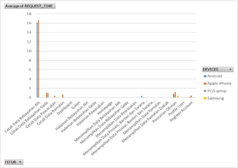 Gambar 10 merupakan grafik uji coba yang menghitung waktu yang dibutuhkan devices atau perangkat untuk mengakses fitur yang ada pada Sistem Informasi Bebayuhan Oton.