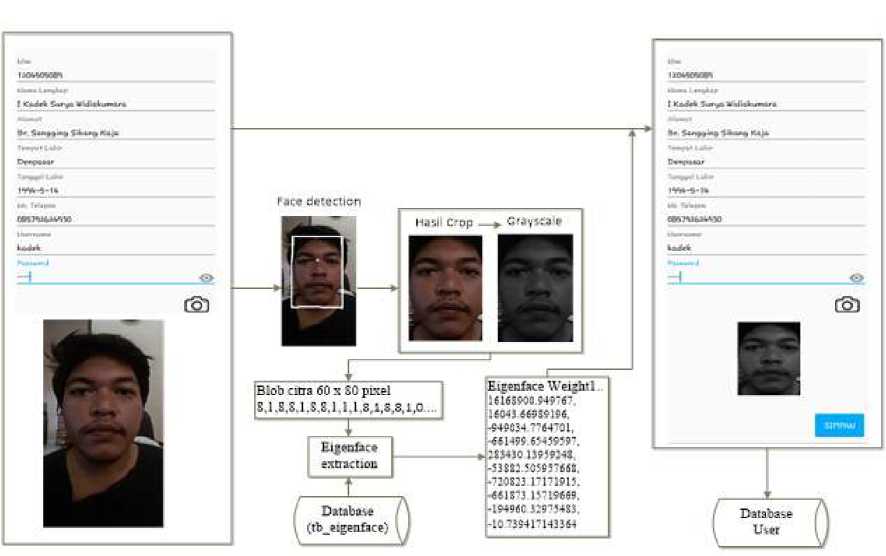 Pendaftaran dimulai dengan meng-input-kan data lengkap user beserta foto yang bersangkutan. Foto di resize dengan ukuran 134x240 pixel. Deteksi wajah pada foto yang di resize dilakukan dengan mencari titik tengah wajah, batas kiri, batas kanan, batas atas dan batas bawah. Proses cropping dilakukan dengan kententuan hasil citra berukuran 60x80 pixel. Citra hasil cropping dikonversi menjadi citra grayscale. Citra grayscale diubah menjadi flat vector atau array satu dimensi. Eigenface extraction dilakukan untuk mengekstrak data citra grayscale untuk mendapatkan Eigenface weight atau nilai bobot dari citra. Semua proses telah dilakukan, maka data disimpan menjadi satu antara identitas dengan nilai bobot yang telah didapat kedalam database.