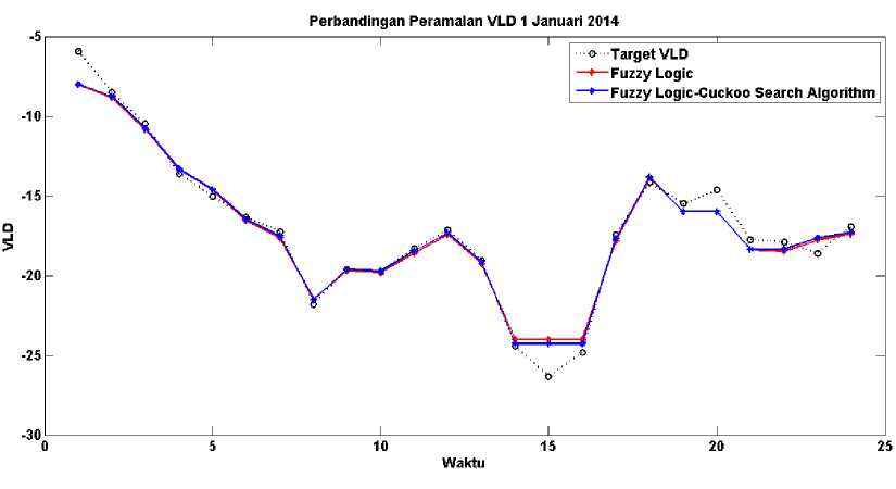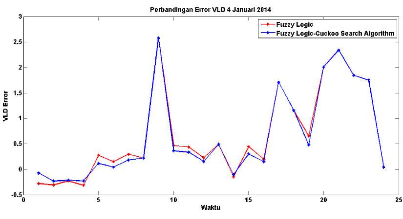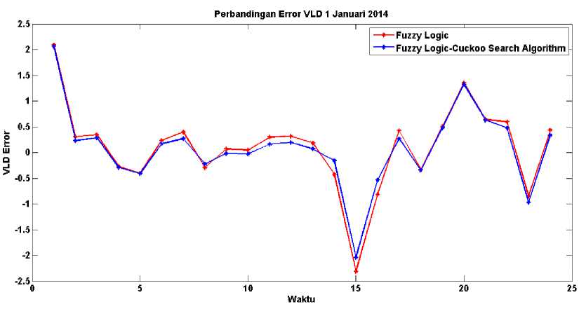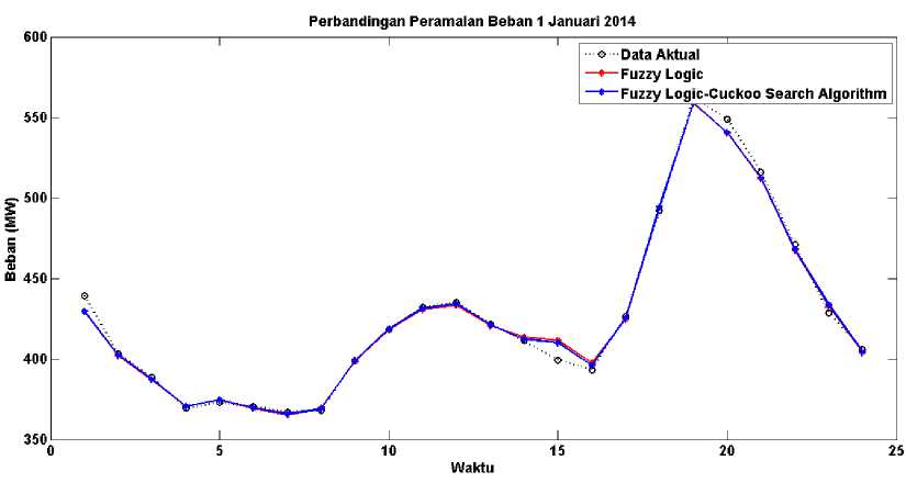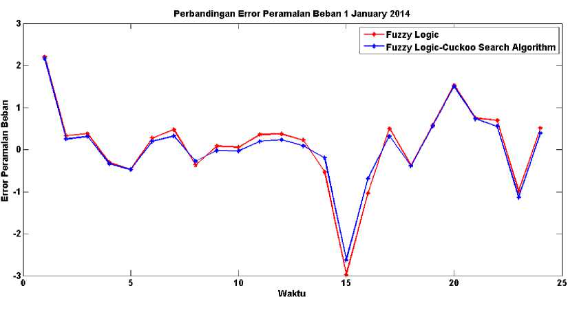 Logic that is not optimized. The analysis results using input data 3 months before day H, to predict the load for one week on January 1 to 7 january 2014, and as a comparison used the predicted day H data. From the simulation results, the mean absolute percentage error (MAPE) is smaller using FLCSA, for the smallest MAPE on 1 January 2014 of 0.06785208%. While the highest MAPE on January 4, 2014 amounted to -0.44973%.