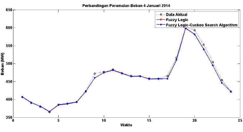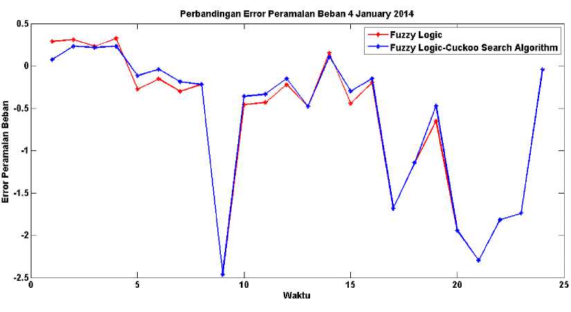 Dari hasil simulasi didapatkan MAPE terbesar pada tanggal 4 January 2014, yaitu sebesar -0.62916 dengan menggunakan FL-CSA. Berikut gambar 5-8 hasil untuk peramalan beban pada tanggal 4