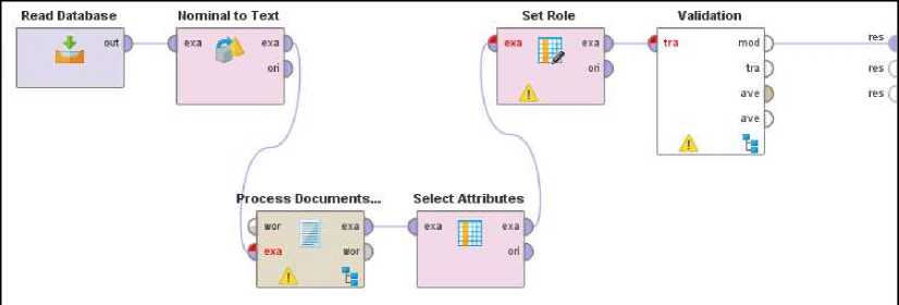 Tahap klasifikasi dilakukan dengan menggunakan algoritma SVM yang diimplementasikan pada RapidMiner 7.5 dengan pengaturan operator seperti pada Gambar 2. Algoritma NB digunakan sebagai pembanding berdasarkan penelitian sebelumnya. Sedangkan parameter-paramater yang digunakan adalah seperti pada Tabel 2 berikut.