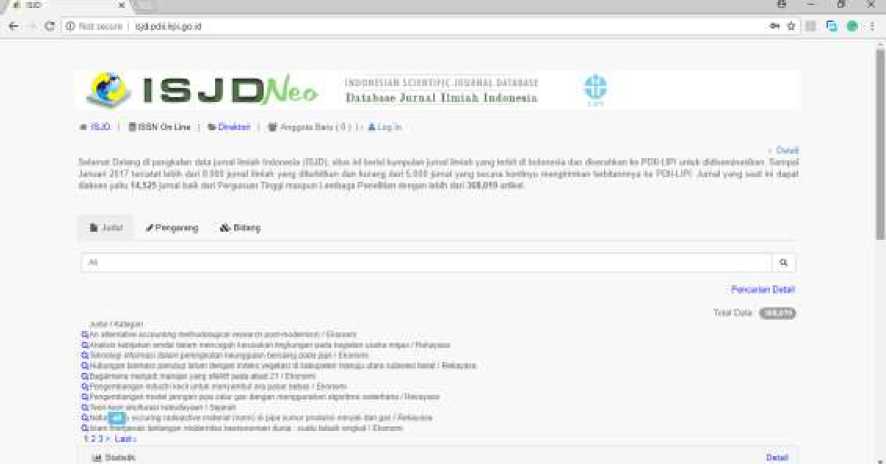 Similar systems in Indonesia which are the reference for the development of a journal aggregator system are Indonesia One Search (http://onesearch.id/) in Figure 2 and Indonesian Scientific Journal Database (ISJD) (http://isjd.pdii.lipi.go.id/) in Figure 3. Indonesia One Search (IOS) is created by National Library (Perpunas) Republic of Indonesia. Through IOS, users can search public collections of libraries, museums, archives, and e-resources in Indonesia. IOS can be used to input a digital collection repository.