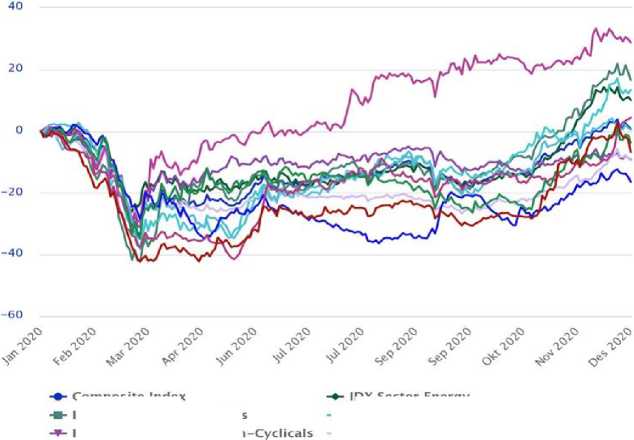 Indeks harga saham merupakan ukuran statistik yang mencerminkan seluruh pergerakan harga atas sekumpulan saham yang tercatat di Bursa Efek Indonesia (BEI). Pada bursa saham terdapat indeks sektoral sebagai ukuran dari pergerakan harga saham berbagai industri. Berikut ini merupakan pergerakan indeks harga saham sektoral di BEI pada tahun 2020.