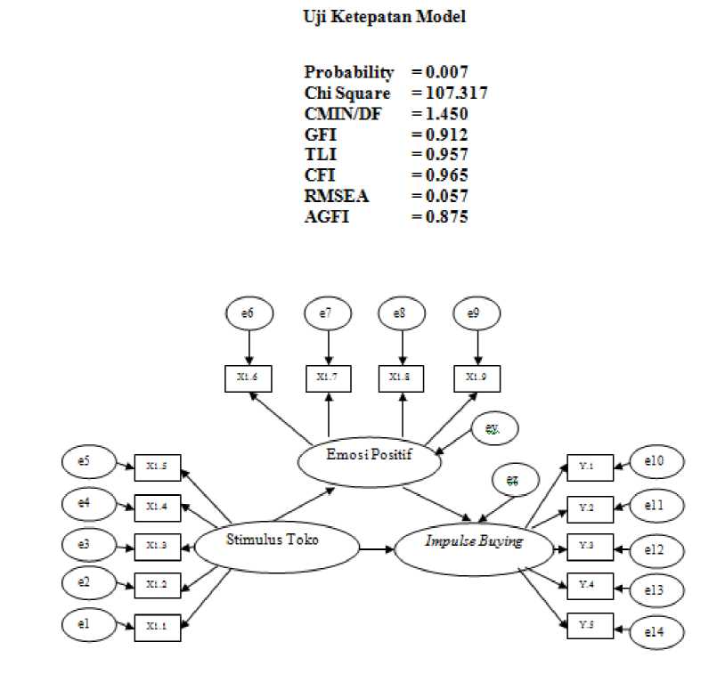 variabel memiliki suatu ukuran yang reliabel, karena masing-masing variabel mempunyai nilai construct reliability ≥ 0,70. Nilai Construct Reliability dari stimulus toko adalah sebesar 1,23. Nilai Construct Reliability dari emosi positif adalah sebesar 1,19. Terakhir, nilai Construct Reliability dari impulse buying adalah sebesar 1,63.