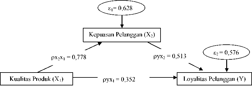 Simpulan yang didapat dari data tabel diatas; (1) besarnya pengaruh langsung kualitas produk (X1) terhadap kepuasan pelanggan (X2) adalah 0,7782 = 0,605 atau 60,5%, sedangkan sisanya 39,5% dipengaruhi faktor-faktor lain, (2) besarnya pengaruh langsung kualitas produk (X1) terhadap loyalitas pelanggan (Y) adalah 0,3522 = 0,123 atau 12,3%, sedangkan sisanya 87,7% dipengaruhi faktor-faktor lain, (3) besarnya pengaruh langsung tidak langsung kualitas produk (X1) yang terhadap loyalitas pelanggan (Y) adalah 0,3992 = 0,159 atau 15,9%, sedangkan sisanya 84,1% dipengaruhi faktor-faktor lain, (4) besarnya pengaruh langsung