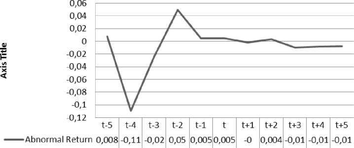 Rata- rata abnormal return t-5 bernilai positif sebanyak 0,008125 dan standar deviasi sebanyak 0,026540737. Rata-rata abnormal return bernilai positif diperoleh pada t-5, t-2 t-1, t dan t+2. Rata-rata abnormal return bernilai negatif diperoleh pada t-4, t-3, t+1, t+3, t+4 dan t+5. Rata-rata abnormal return yang tertinggi diperoleh pada t-2 dan rata-rata abnormal return yang terendah didapat